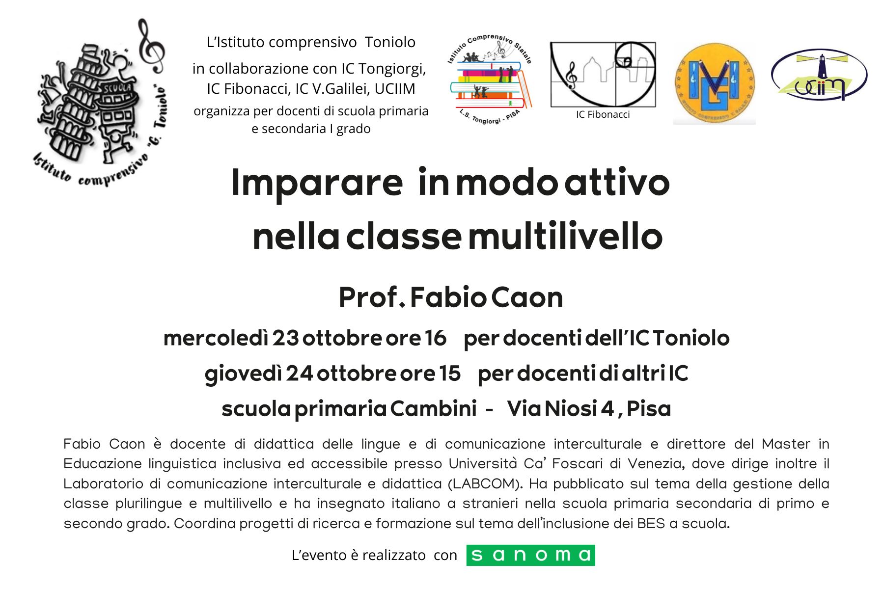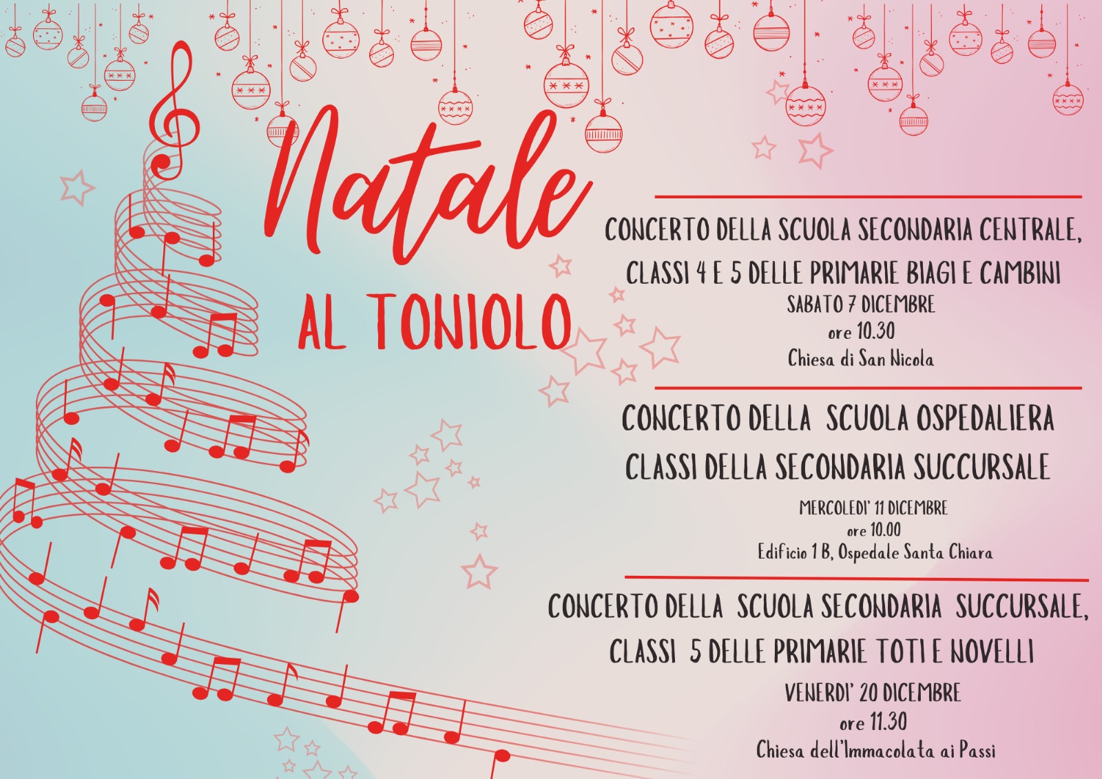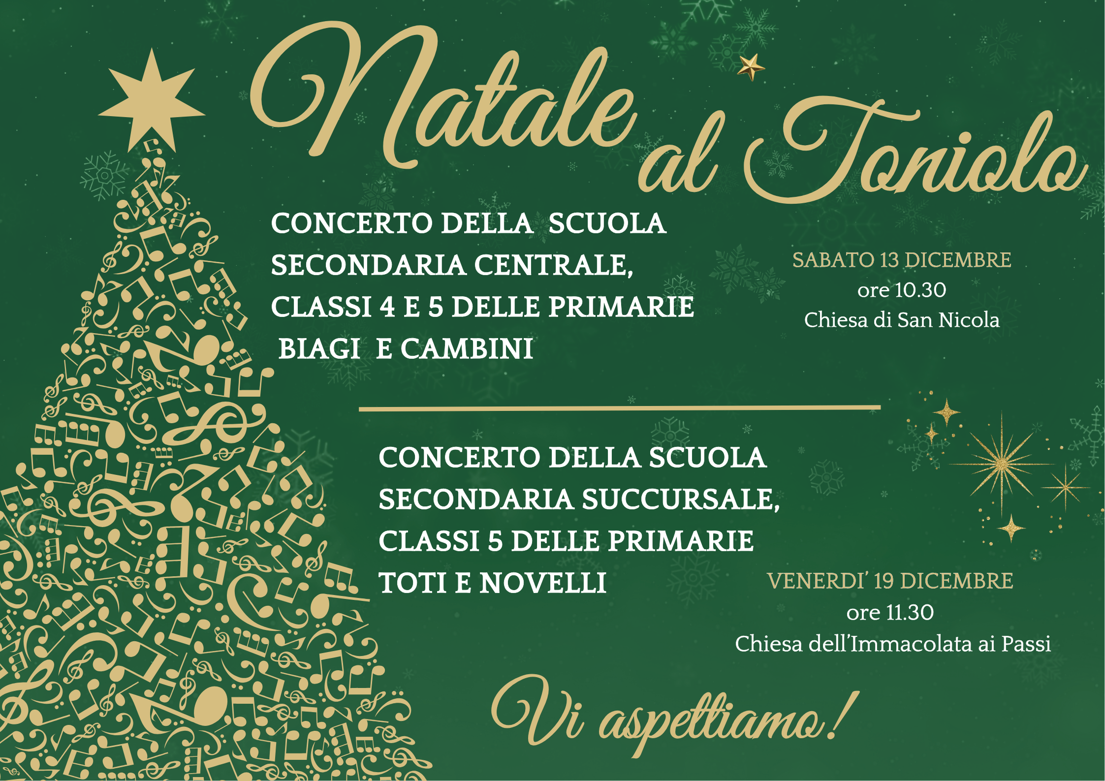 Sabato 6 dicembre alle 17 davanti a Palazzo Blu le quinte di Cambini e Biagi allieteranno con canti natalizi l’inaugurazione dell’Albero di Natale Sabato 13 dicembre alle 10.30 nella chiesa di San Nicola, il grande concerto natalizio della Toniolo centrale con le quarte e quinte Biagi e Cambini Domenica 14 dicembre alle 15.30 nella chiesa »