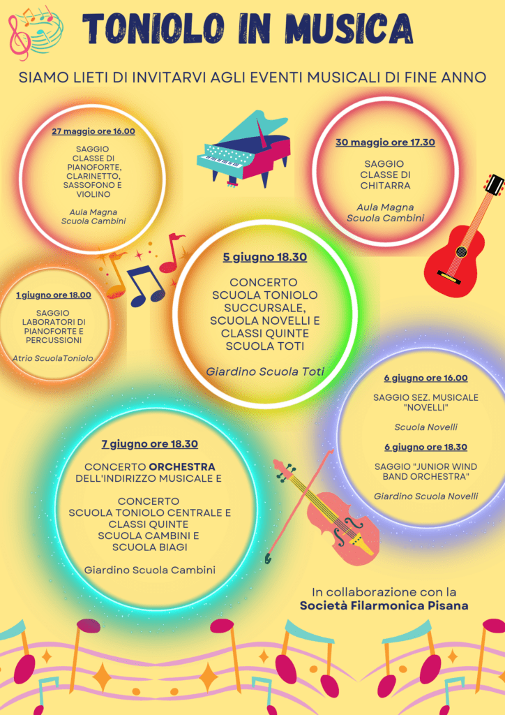 Dopo la presentazione dell’indirizzo musicale alla presenza di Provveditore e Assessore comunale all’istruzione (articolo La Nazione), i successi dei nostri alunni al concorso musicale Città di Scandicci (vedi “Musica al Toniolo” sulla home del sito), la partecipazione dell’orchestra dell’istituto alla Rassegna regionale Toscana Musica (vedi più avanti link al servizio), la celebrazione della festa della Musica nel plesso di Barbaricina e alla Scuola in ospedale, siamo lieti di inviarvi agli eventi musicali di fine anno scolastico: