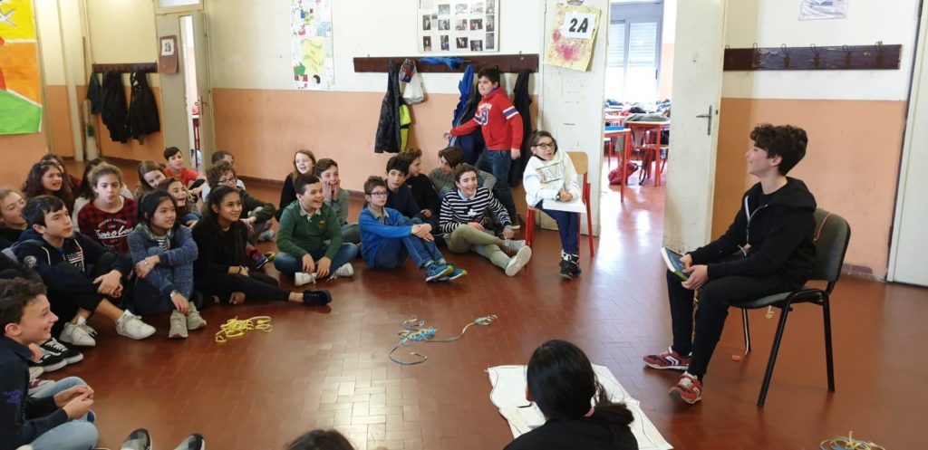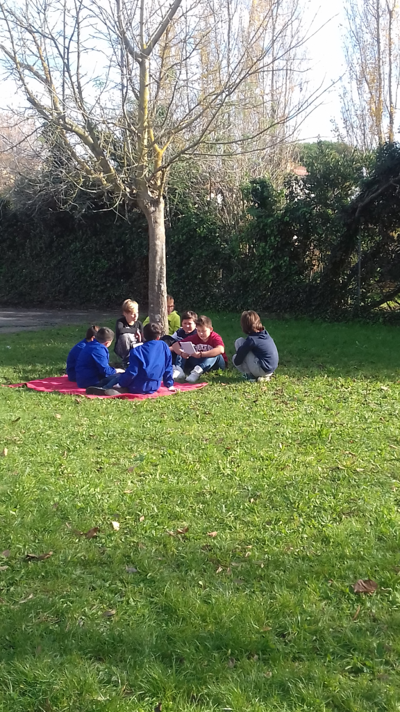 Giardino di Barbaricina: ragazzi delle medie, preparati e emozionati, leggono libri ai bambini della primaria Toti, attenti e curiosi. Perché scuola si fa anche così!