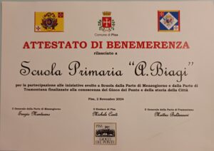La scuola Biagi ha ricevuto un attestato per le attività svolte in collaborazione con la parte di Mezzogiorno del Gioco del Ponte nella cerimonia tenuta presso la cappella di S. Agata