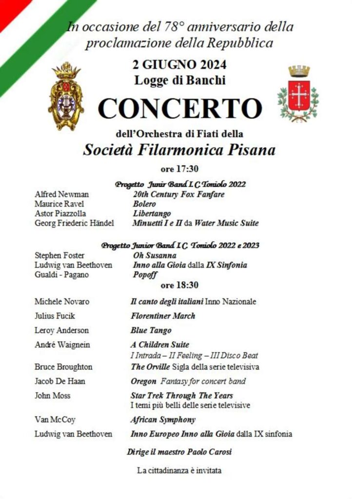 Due giugno, ore 17.30, Logge di Banchi: la Junior Wind Orchestra del nostro istituto, nata grazie al progetto e alla competenza della Società Filarmonica Pisana, aprirà il tradizionale concerto cittadino offerto alla città in occasione della Festa della Repubblica.