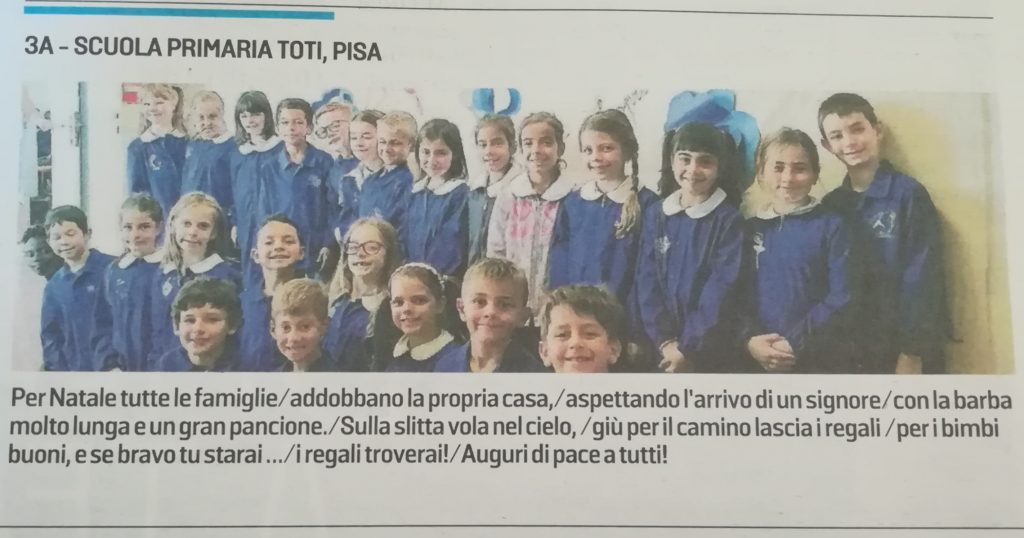 L’Istituto comprensivo Toniolo ha fatto gli auguri di Natale in musica in due grandi concerti che si sono svolti venerdì 20 e sabato 21 dicembre. Il primo è iniziato sul piazzale della chiesa di San Ranieri al CEP con l’intervento di una rappresentanza della magistratura dei Satiri del Gioco del Ponte, ed è proseguito nella chiesa dove l’orchestra di flauti delle classi della scuola secondaria Toniolo succursale si è esibita insieme al coro delle classi quinte delle scuole primarie Novelli e Toti: musiche natalizie ma anche brani della tradizione gospel e di attualità, come la Ninna nanna del bambino sul barcone. Per vivere il Natale pensando anche agli altri, esplorando i sentimenti e l’umanità che a volte vengono oscurati dall’aspetto commerciale; un’occasione di riflessione ed emozione, dove alla musica si sono accompagnate le poesie e i pensieri scritti dai ragazzi. Il giorno seguente, sono state invece due magistrature di Mezzogiorno (San Martino e Sant’Antonio) ad introdurre con il loro corteo storico il secondo grande concerto del comprensivo Toniolo; nella chiesa del Carmine si sono esibiti gli alunni della scuola secondaria Toniolo centrale (flauti e voci) e delle quinte delle primarie Biagi e Cambini: interventi di bambini e ragazzi nel ruolo di solisti all’interno di brani corali che hanno stupito per la qualità dell’esecuzione. Presente anche uno stand della sezione ospedaliera dell’istituto Toniolo, con le insegnanti di scuola dell’infanzia, primaria e secondaria che operano con bambini e ragazzi ricoverati nel reparto di oncoematologia pediatrica dell’ospedale Santa Chiara: una testimonianza di scuola che si fa vicina e aiuta chi vive la malattia a recuperare un po’ di normalità. Sono stati due importanti appuntamenti per il comprensivo Toniolo che ha dato prova di grande attenzione e qualità anche relativamente alla musica, uno degli elementi caratterizzanti la propria offerta formativa; musica che dal prossimo anno scolastico sarà ancor più valorizzata grazie a diversi progetti che stanno prendendo forma concreta proprio in questo periodo.