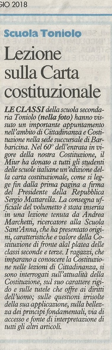 La costituzione donata ai ragazzi della scuola secondaria succursale e centrale durante due coinvolgenti lezioni del dott.re Andrea Marchetti.